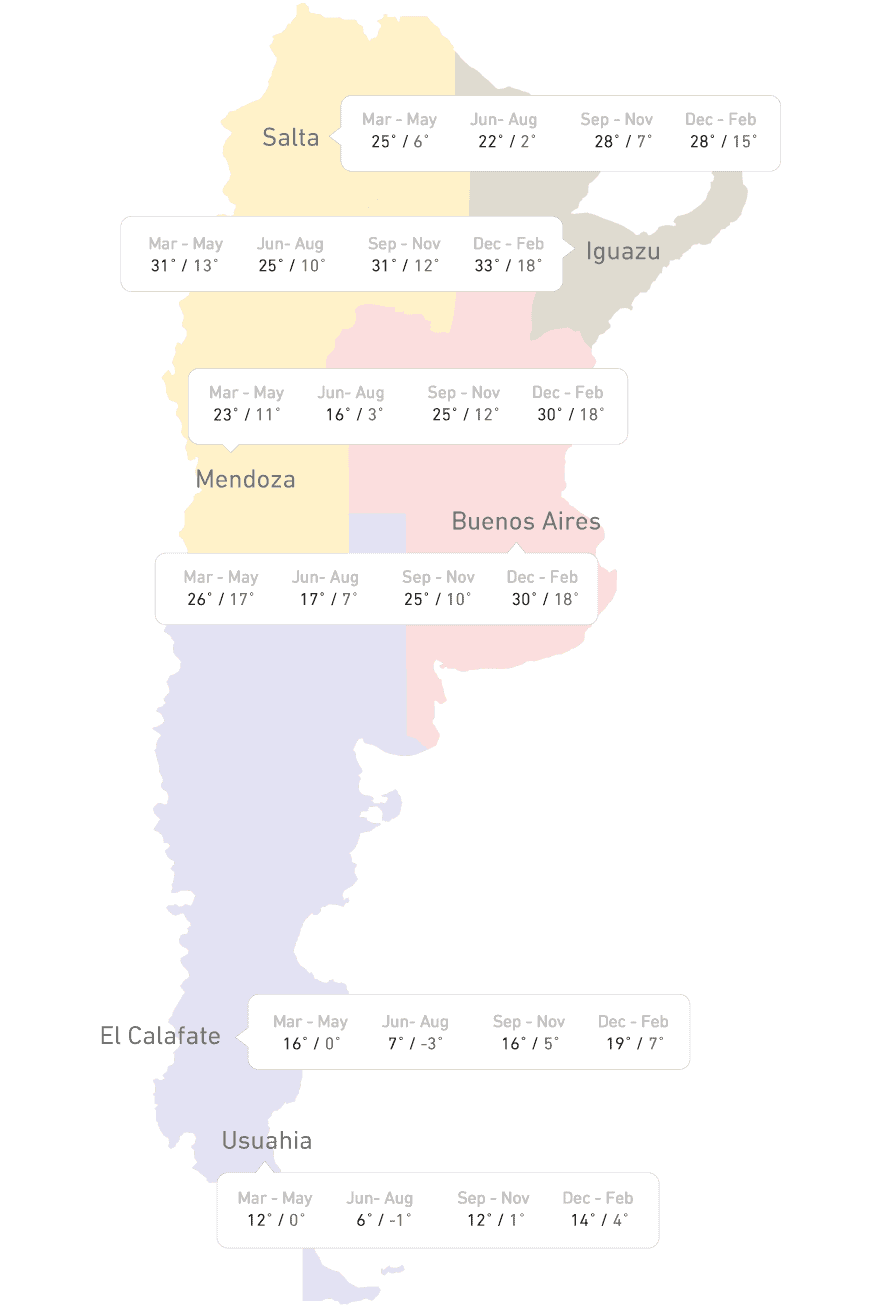 December to March (summer time) are the best months to travel to Argentine Patagonia and Tierra del Fuego. Daytime high temperatures during the months of November through February on the mainland will be between 15-22° C (58-72°F). Nighttime temperatures range between 4-7°C (40-45°F). Pack a variety of clothes and dress in layers. The winter months, July and August, can be extremely cold and facilities sometimes shut down.