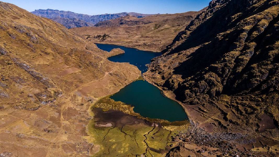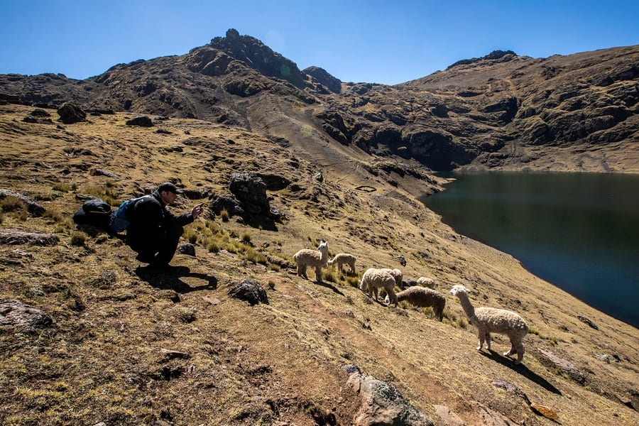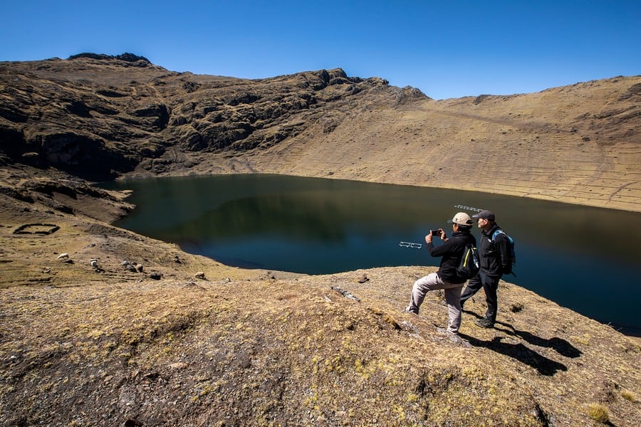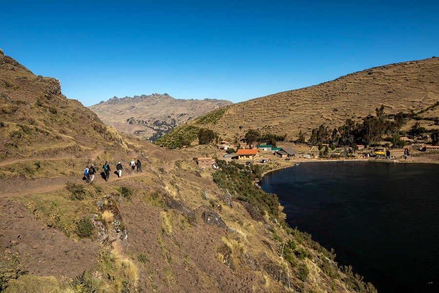 Next, you will stretch your legs on a 2–3-hour hike far away from any tourist trails. You start at the Azul Cocha lagoon at around 4,050 m (13,287 ft) and follow a path around the lake, which meanders up to the Puma Cocha lagoon (4300 m / 14107 ft). From here you can enjoy a magnificent view of the surrounding mountain peaks. The path slowly leads you downhill. You might pass some shepherds on the way, who graze their herds of llamas and alpacas on the steep terrain. Your hike ends at the sparkling dark blue lagoon Kinsa Cocha (4030 m / 13221 ft), nestled in between Andean peaks, ochre earth, and potato fields.