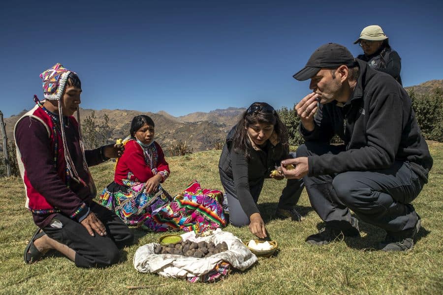 Don’t miss the chance to taste some different types of delicious potatoes, traditionally cooked as ‘Huatia’ in an earth oven. Next, you will be taken to the Chahuaytire weaving community about 40 minutes away to witness the impressive culinary creativity in the Potato Park by trying a typical lunch in a community-run restaurant. Before being dropped off at your hotel, make sure to check out the community of Sacaca where you will have the chance to purchase various local herbs and teas with excellent curative properties.